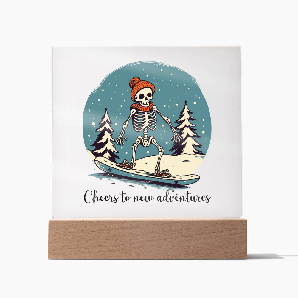 Step into a winter wonderland with our "Snowboarding Skeleton Acrylic Dome Plaque". A perfect blend of Christmas spirit and zealous snowboarding adventure, it's more than just a piece of decor - it's a symbol of dynamic existence, a nod to those who see life as a thrilling ride even when the weather gets chilly. Imagine this striking piece on your mantelpiece or catching the light in your window. In its presence, each day starts with a promise of a new excursion and ends with a friendly reminder of the joyful Christmas season. It's more than a gift - it's a sentiment, an expression of love and appreciation towards the thrill-seekers in your life. Our plaques are meticulously crafted from premium acrylic, showcasing a cheerfully absurd skeleton - sporting a red hat and scarf, snowboarding over white expanses beneath snow-covered trees. The message - "Cheers to new adventures", mirrors the fearlessness symbolized by the image. Your plaque sits atop a sleek wooden base, however, for that extra splash of style, upgrade to our wooden LED base with USB plug-in. Light it up and illuminate your space in a warm, entrancing glow.